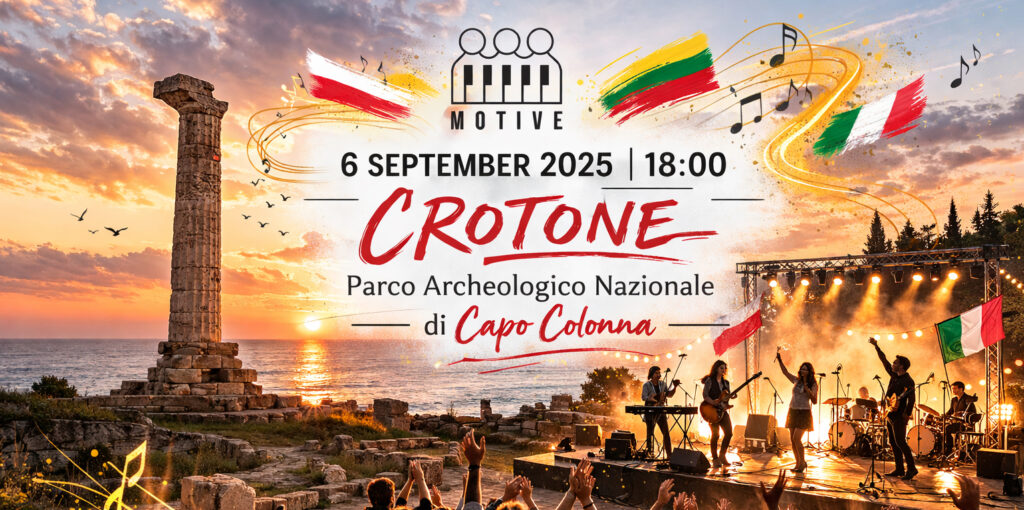 On 6 September 2025, the MOTIVE – Merging Original Traditions Into New Voices of Europe project will reach its culminating moment. Set in the exceptional surroundings of the Parco Archeologico Nazionale di Capo Colonna in Crotone, the Final Concert will mark the artistic conclusion of an international collaboration bringing together young musicians from Poland, Lithuania and Italy.